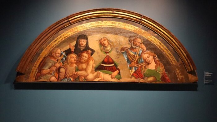 La lunetta con il “Compianto del Cristo morto” della prima metà del ‘500 all’esposizione “L’identità ritrovata” nel Rotary Point a Borgo di Arquata del Tronto, agosto 2025. Foto Stefano Miliani
