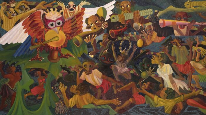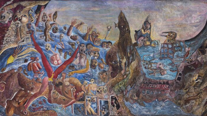 La Serenissima offre altri due incontri africani di rilievo. Il primo è in corso fino al 10 gennaio a Palazzo Grassi della Pinault Collection con un pittore di altissima levatura e inventiva, Michael Armitage, keniota e britannico che divide la vita con l’Indonesia. Per le cure di Jean-Marie Gallais e catalogo edito da Marsilio, con “The Promise of Change” espone circa 45 dipinti e oltre 120 disegni. L’artista si cimenta tanto con le proteste civili nel suo Kenya come con il fenomeno dei migranti che affrontano il mare dall’Africa verso l’Europa; attraverso la pittura reinventa una tradizione novecentesca rendendo le sue figure drammatiche, universali, tra immaginazione sfrenata ed echi della realtà. Armitage dipinge su un tessuto ricavato dall’albero mutuba secondo le tradizioni ugandese e indonesiana. Tra le sue fonti d’ispirazione cita il regista senegalese Ousmane Sembène, lo scrittore keniota Ngugi wa Thiong’o (1938–2025), Goya. Suo il dipinto in apertura di questo articolo.