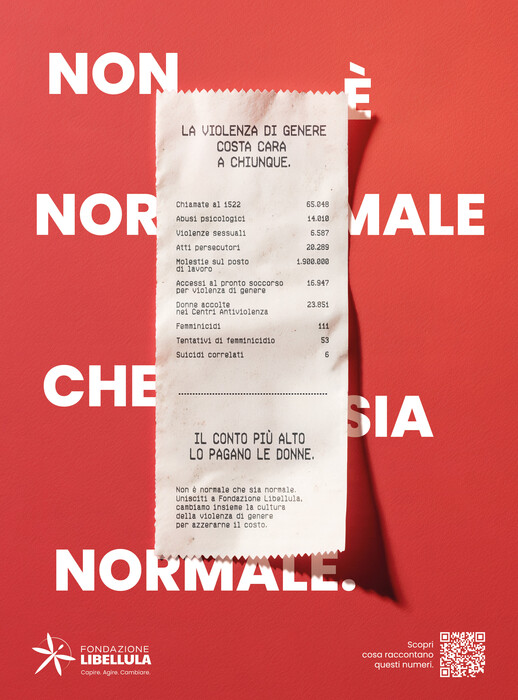 Da questo assunto nasce l’iniziativa Conto in rosso, della Fondazione Libellula. Un banale scontrino, diviene simbolo del debito sociale della violenza di genere. “Questa campagna vuole essere una presa di coscienza collettiva in cui raccontiamo i veri costi della violenza di genere. Perché la violenza non è un problema individuale: è un debito sociale che continuano a pagare tutti e tutte, ogni giorno” ha dichiarato Debora Moretti, fondatrice e presidente della Fondazione Libellula.